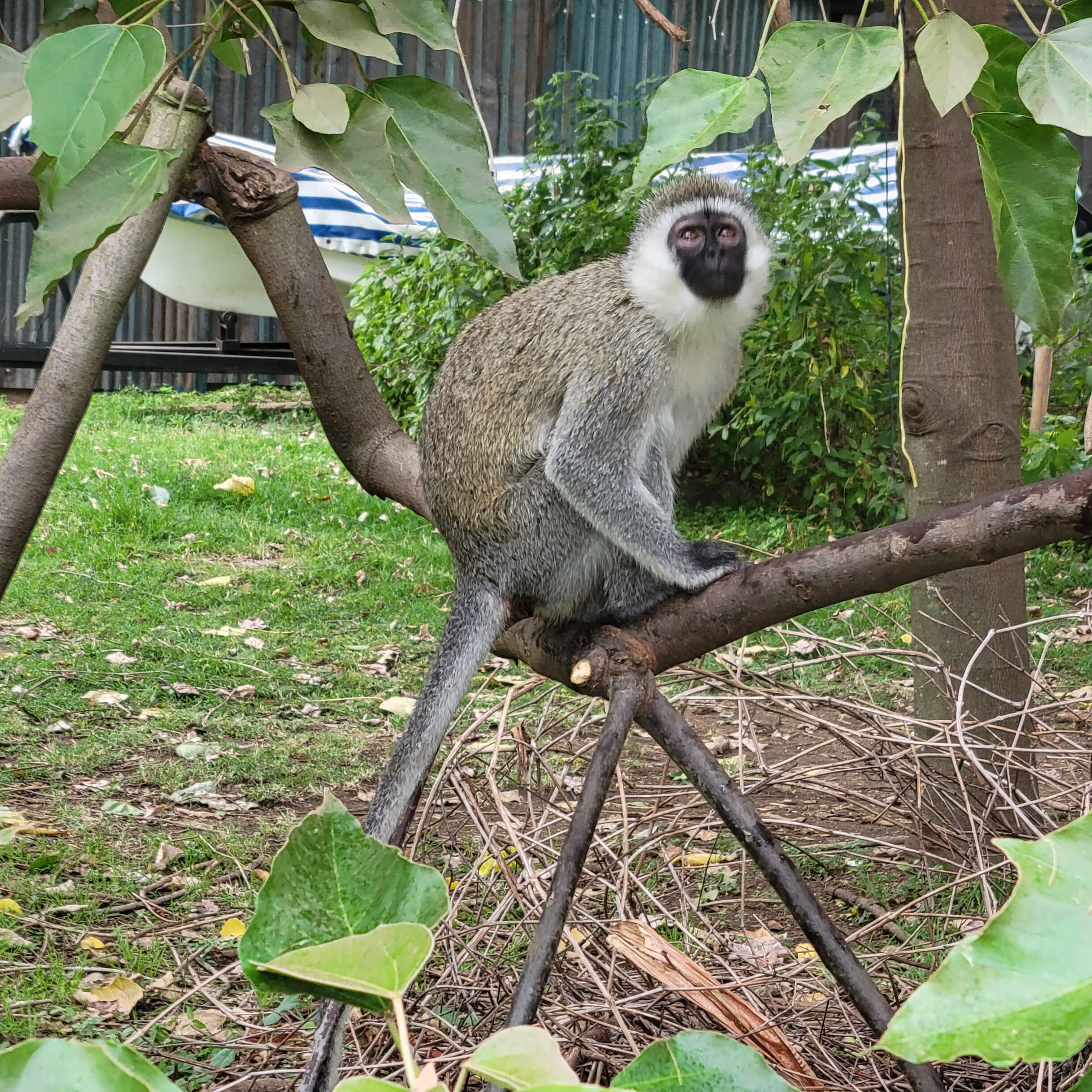 Un singe face noire aux abords du Lac NaïvashaAu loin un couple de Calaos à bec rouge dans la Réserve Nationale de Samburu