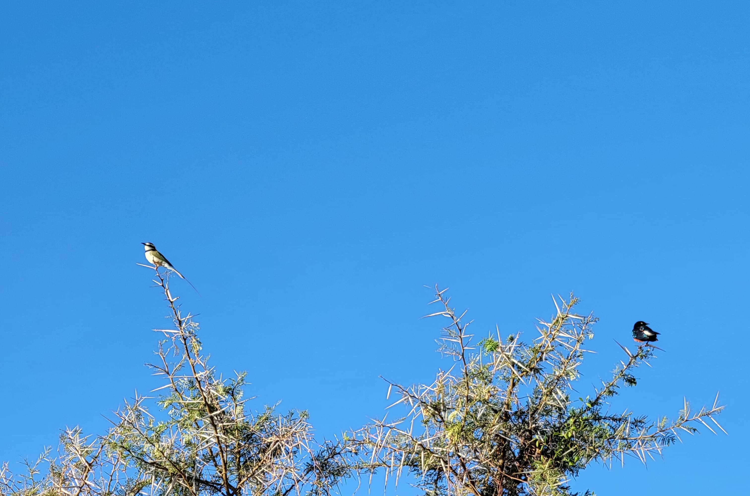 Criquets pèlerins sur une aiguille d’Acacia aux alentours d’Ol Gaboli en terre MassaïSinges Colobes noirs et blancs ici perchés bien haut